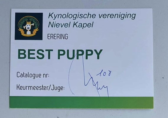 Auch er hat seine Ausstellung am 03.08. gemeistert, und zwar in Belgien auf der Gent - Dulle Griet - Open Show. Browning überzeugt Richter Nico Kersten (DE) und wird mit Vielversprechend 1, best puppy belohnt.